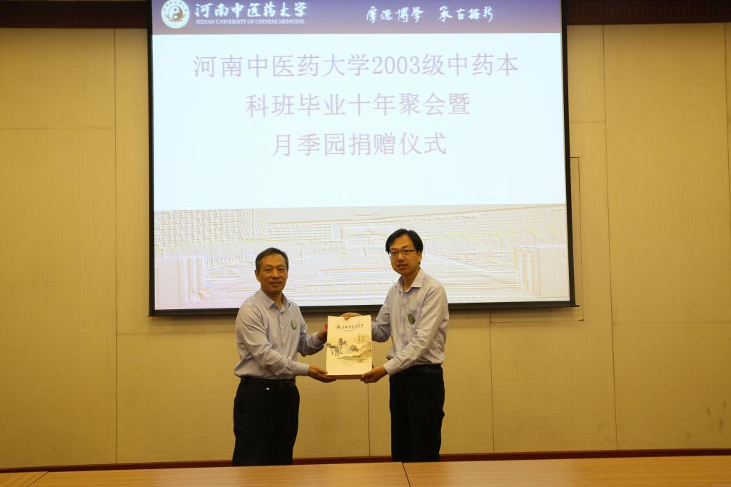 2017年4月30日上午,龙子湖校区内春意盎然,鸟语花香。我校2003级中药本科班毕业十年聚会暨月季园捐赠仪式在图书馆第三报告厅举行。副校长徐江雁、药学院党委书记陈随清、学生处副处长李俊芝、药学院党委副书记杨文胜、副院长崔瑛、校友办主任张婷婷及教师代表左艇等出席了会议。会议由2003级中药本科班班长宋岩主持。