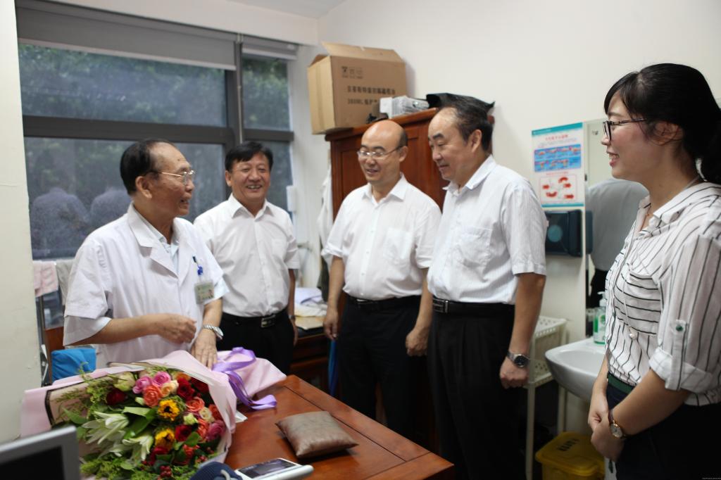2018年8月19日上午,在首届“中国医师节”当日,河南省教科文卫体工会主席符明轩在我校一附院党委书记翟剑波、副院长蒋士卿的陪同下,亲切慰问了在国医堂坐诊的老专家,送上了节日的祝福。