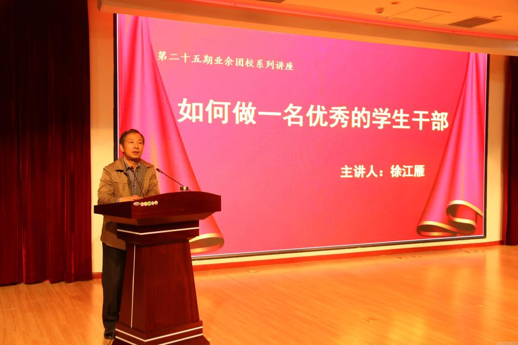 2015年11月9日中午,副院长徐江雁教授为我校第二十五期业余团校暨学生干部培训班作了题为《如何做一名优秀的学生干部》的专题报告。校团委全体老师、各二级院系分团委老师与350余名学员共同聆听了此次报告会。报告会由团委书记郭婧主持。
