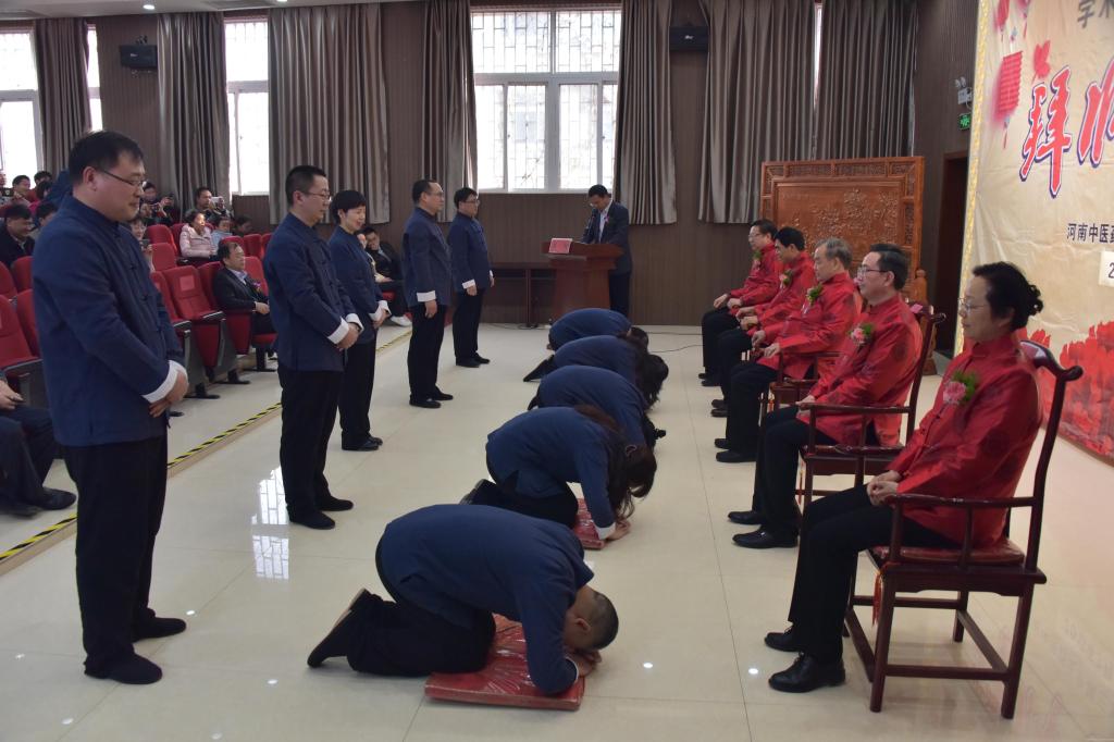 2018年3月9日,第六批全国老中医药专家学术经验继承工作拜师仪式在我校三附院举行。五名指导老师冯明清教授、李庆海教授、崔应民教授、庞玉琴教授、李郑生教授接受了10名学术经验继承人的跪拜、敬茶、献花。医院党政领导、师生代表和相关媒体参加了拜师仪式。