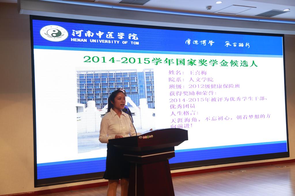 国家奖学金规格高、额度大、激励作用强,学校在前期组织有关专家对各二级学院推荐的41名国家奖学金候选人的原始材料进行了集中审核打分的基础上,举行了公开展示环节。各位候选人通过3分30秒的精彩演讲,展现了他们品学兼优、自立自强的形象,表达了德育为先、学习为重、全面发展的理念。他们将高觉悟的思想转变为行动的先导,勤学笃行化作骄人成绩,综合素质炼出能力提升,课外活动充实着大学生活。经过精彩的角逐,来自第一临床医学院的朱晓丹和药学院的王攀等28名候选人成为2014-2015学年国家奖学金获得者。