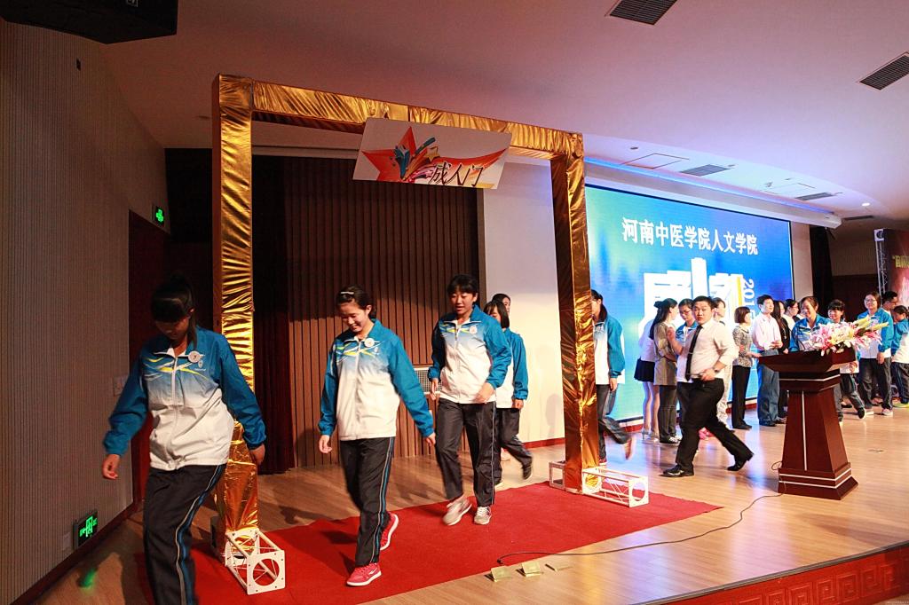 随着一曲《感恩的心》,同学们在深情的歌声中回顾父母、师长、社会对他们的教诲和付出。20名新生代表上台向大家喊出了自己的梦想和愿望,他们以铿锵有力声音表达了必将不负众望、努力进取的决心。紧接着,在主持人的带领下,人文学院2015级全体新生举起右手,庄严宣誓:“我立志成为有理想、有道德、有文化、有纪律的社会主义公民。遵守宪法和法律,热爱社会主义祖国,拥护中国共产党的领导。正确行使公民权利,积极履行公民义务,践行社会主义核心价值观,自觉遵守社会公德。爱国守法,明礼诚信;崇尚科学,追求真知;服务他人,奉献社会;完善人格,强健体魄。为实现中华民族的伟大复兴,贡献青春,奋斗终生!”洪亮的誓言再次表达了他们迈向人生的新起点并勇于承担社会责任的决心。最后,2015级新生分组在成长墙上签名,领导老师为之行成人礼,同学们携手穿越成人门,完成仪式。