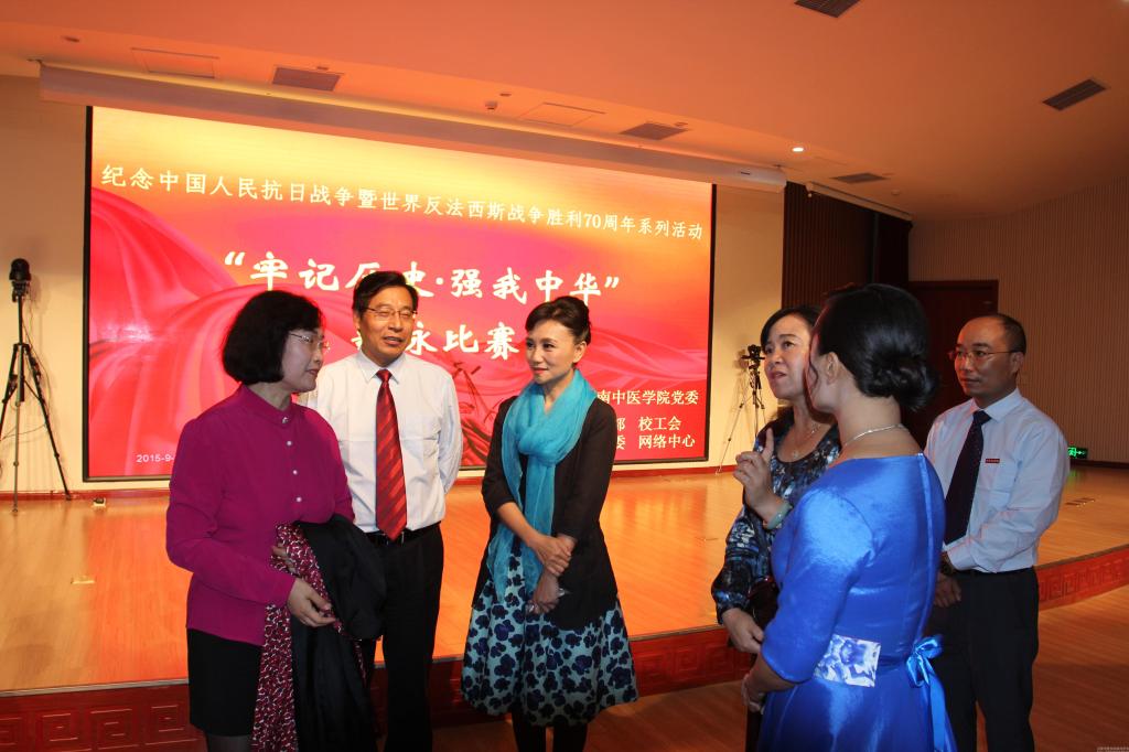 2015年9月24日晚,我校图书馆第一报告厅里座无虚席,气氛热烈。我校纪念中国人民抗日战争暨世界反法西斯战争胜利70周年教职工歌咏比赛在这里隆重举行。院长郑玉玲,原正校级调研员徐玉芳,党委副书记郭海波、张丽霞,副院长张小平、徐江雁,纪委书记许东升出席并参加机关党委的合唱节目。来自全校23个基层党组织组成的15支代表队同台竞技,引吭高歌。党委副书记张丽霞与宣传部、校工会、校团委负责人和学生代表担任本次比赛评委。