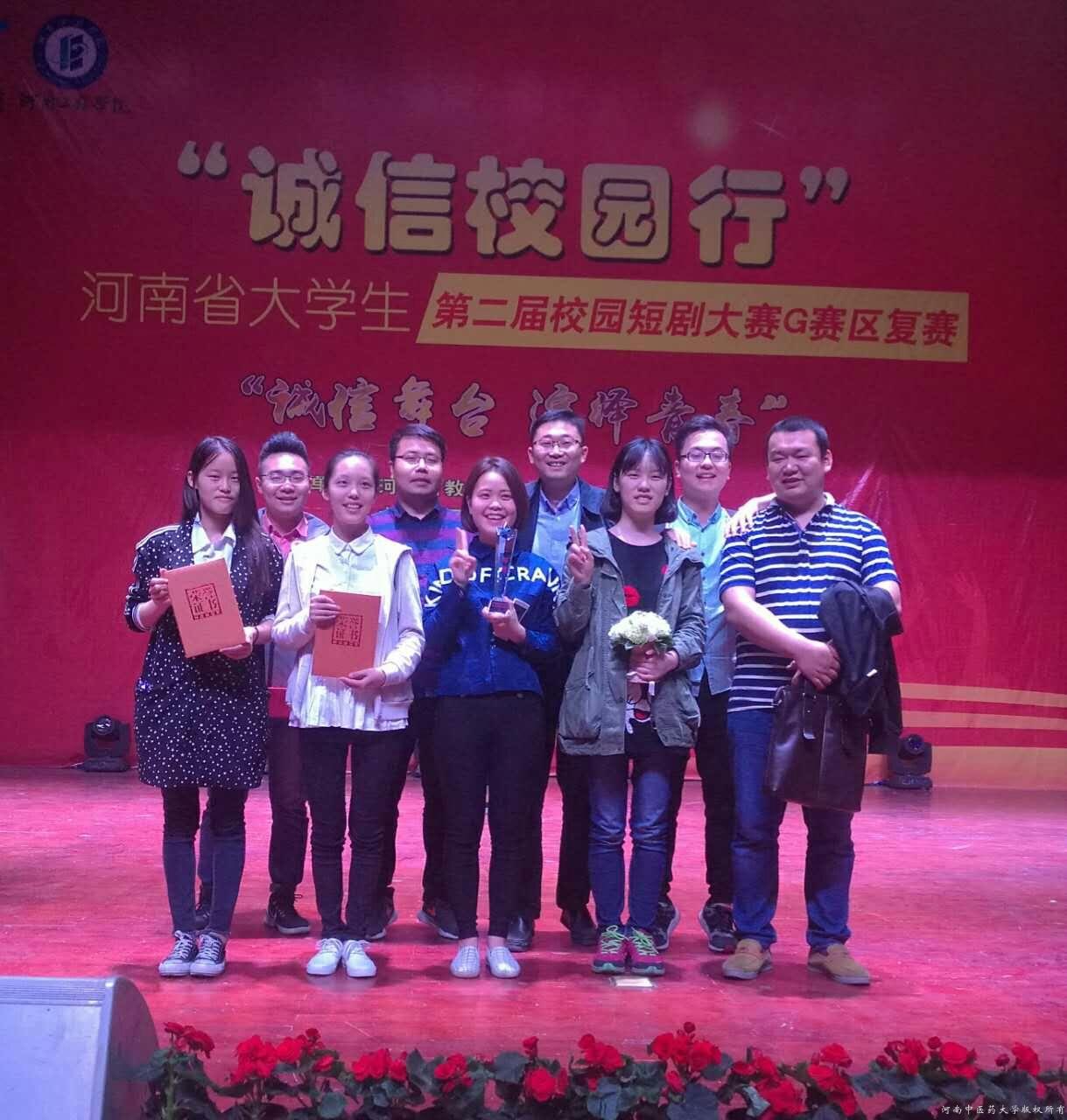 2016年4月21-22日,河南省大学生“诚信校园行”第二届校园短剧大赛G赛区复赛在河南工程学院举行。我校参赛作品《再也不敢啦》荣获复赛一等奖、优秀灯光效果奖,谭新芳同学获得优秀导演奖、李浩同学获得优秀演员奖、邢瑶老师获得优秀指导老师奖。