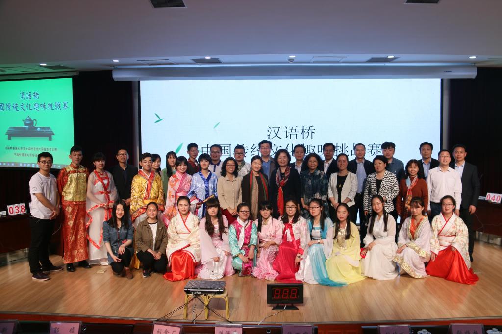 2016年4月28日晚,由外语学院承办的“汉语桥”中国传统文化知识挑战赛决赛在图书馆第一报告厅举行。我校文化建设领导小组组长、校党委副书记张丽霞、校党委宣传部部长刘保庆、学工部部长、学生处处长刘金厂、校团委书记郭婧以及其他学校文化建设领导小组的成员们担任决赛评委。