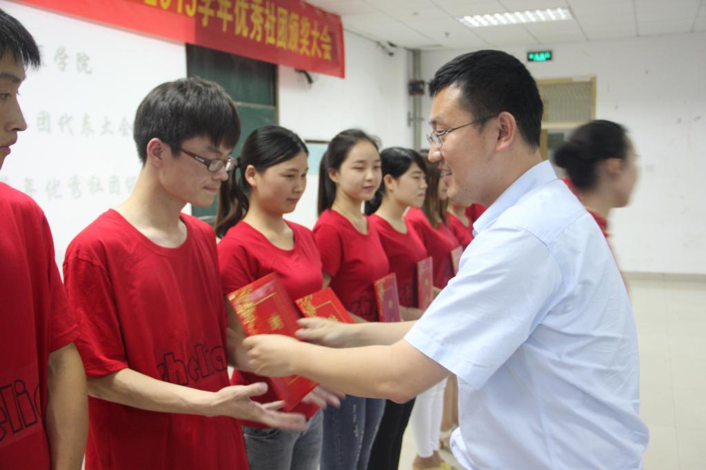 校团委副书记高磊为2014—2015届部长委员会颁发聘书,并对荣获2014-2015年度优秀学生社团、先进志愿服务团队和优秀志愿者代表们进行表彰。