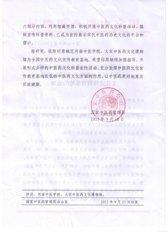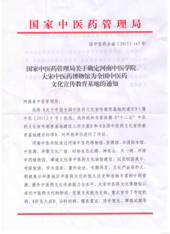 近日,国家中医药管理局下发了《关于确定河南中医学院、大宋中医药博物馆为全国中医药文化宣传教育基地的通知》文件,批准我校为全国中医药文化宣传教育基地。这既是对我校中医药文化宣传教育工作的鼓励和肯定,也对我校下一步做好中医药知识传承、中医药文化弘扬工作提出了新的要求。