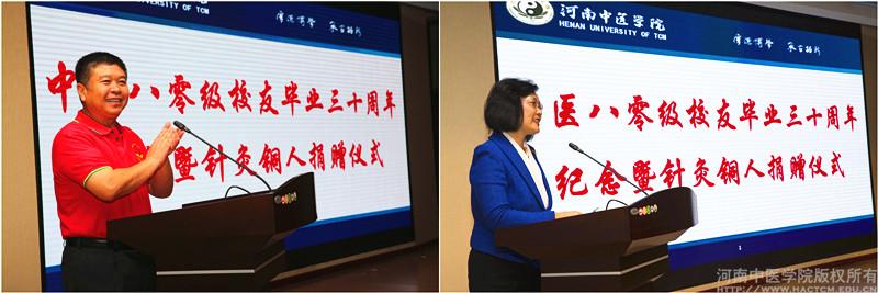 会前,80级校友观看了二十年聚会时的场景,重温了10年前相见时的音容笑貌。会上,首先为校友们播放了学校宣传片《中兴之路》。随后学校党委书记孙建中代表学校党政领导和全体师生员工对80级校友30年后重返母校表示热烈欢迎,并强调学校的建设发展离不开广大校友的关心和支持,希望校友们继续关心母校的发展,共同为中医药事业贡献力量。校长郑玉玲通过PPT的形式分五部分详实地向同学们介绍了学校发展历程、学校基本情况、学校近期工作进展、学校文化景观及学校校友工作等内容。80级当年的辅导员王振超老师带病前来祝贺昔日弟子重返母校,说到动情处,王老师几度潸然泪下。校友代表平顶山市第二人民医院副院长刘擎国和新乡市妇幼保健院党委副书记、副院长陈洪军分别发言,他们情真意切地感怀了在农大校区和东明路校区上学时的同学情、师生谊,回顾了30年来同学们的成长经历,赞叹母校今天的发展变化,相约10年后再回母校团聚!最后80级6个小班的校友代表上台为母校捐赠了“针灸铜人”,祝愿母校明天更美好,老师同学永远幸福安康!孙建中书记和郑玉玲校长代表学校接受捐赠并颁发捐赠证书。