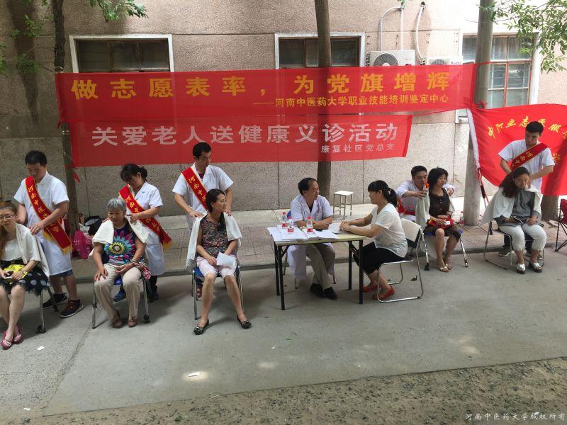 为了响应省文明办的号召,体现“两学一做”学习教育学做结合的要求,2016年7月8日上午,我校职业技能培训鉴定中心党员志愿者服务队走进金水区康复社区,在社区居民中开展了“做志愿表率、为党旗增辉”推拿治疗活动。