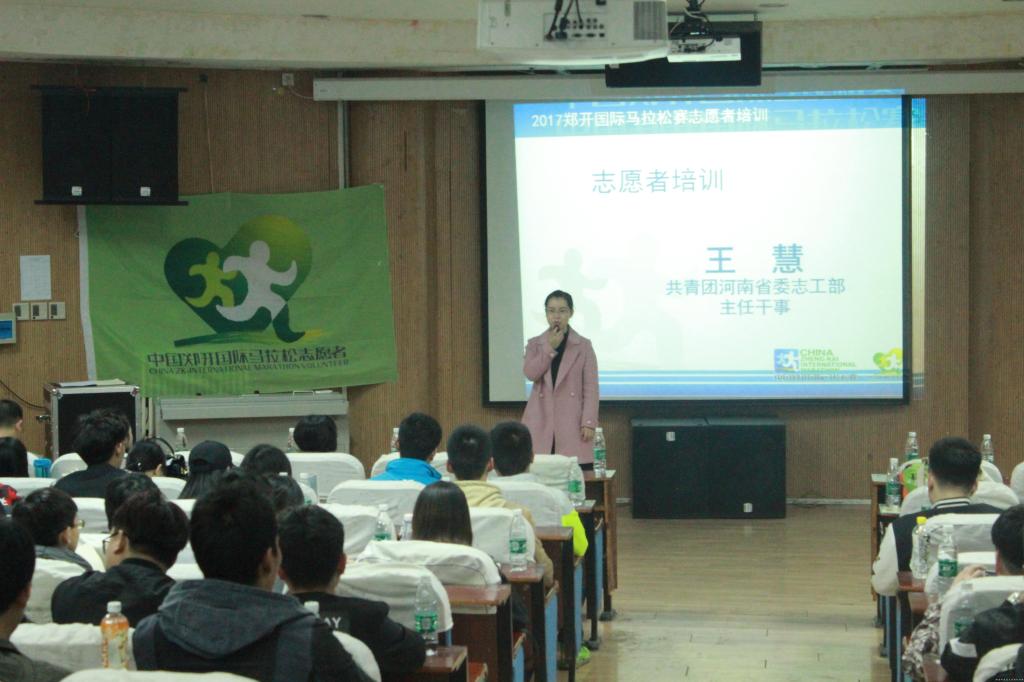 会上,团省委志工部主任干事王慧向志愿者们讲解了志愿者精神。她提出“四个一种”,即一种精神,一种形式,一种内容和一种评估和反馈,详细地向大家讲解了“奉献、友爱、互助、进步”的志愿者精神,此外,她还强调要规范志愿服务活动,传递精神,传播文明。随后,郑开国际马拉松赛组委会竞赛部副部长郝海涛用诙谐幽默的语言向在场的同学们讲解了志愿服务的注意事项及工作要求。最后,中国红十字会培训救护培训师丁利娟针对志愿服务应急事件医护求助常识对志愿者们进行了细致培训。整场培训会内容丰富,气氛活跃,让志愿者们在轻松的氛围下学习了志愿服务工作的相关内容。