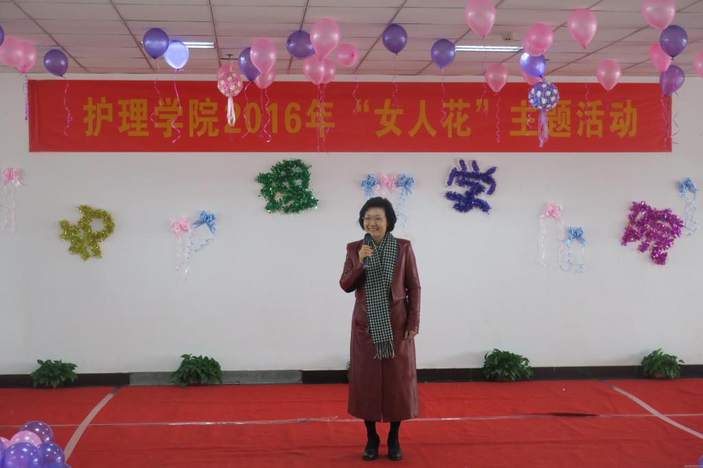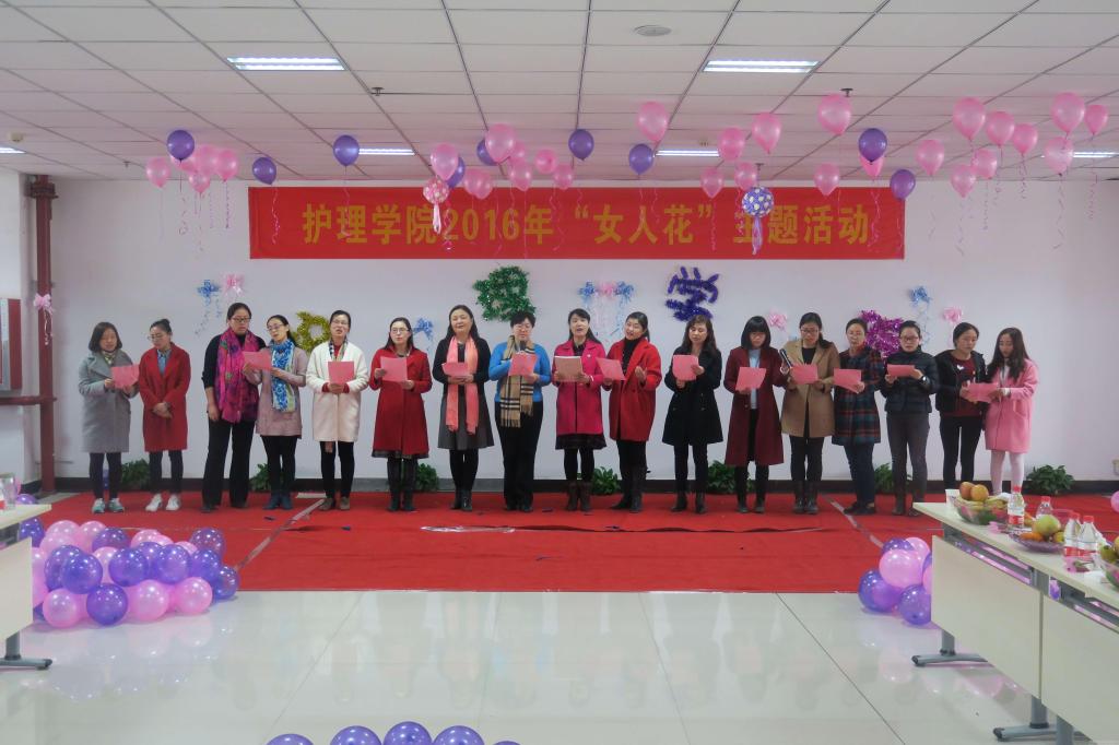 为了丰富护理学院女教职工的业余文化生活,活跃校园文化气氛,展示女教职工自尊、自强、执着、奉献的优良品格,2016年3月8日下午,护理学院在教学楼B3区9楼大厅举办了“女人·花”主题活动,庆祝 “国际三八妇女节”。校长郑玉玲、宣传统战部部长刘保庆、副部长张顺超、离退休处党总支书记程伟华、信息技术学院党委书记张峥丽、外语学院党委书记蒋时红及工会、体育教研部、康复医学院等老师与护理学院全体教职工、兼职班主任和学生们一起度过了一个快乐的节日。