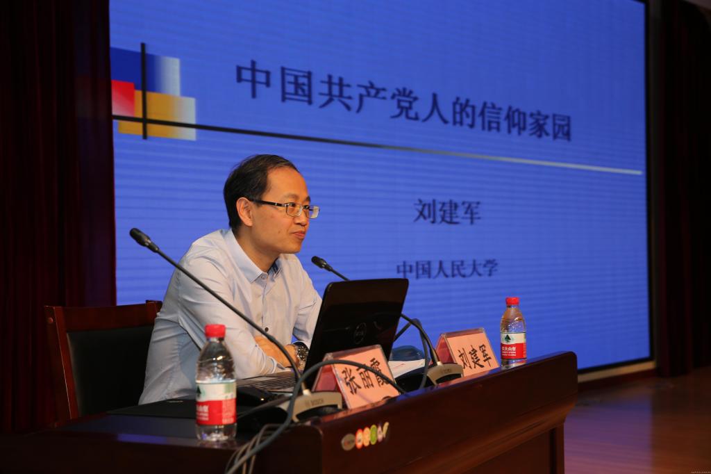 2016年5月27日上午,中国人民大学马克思主义学院教授刘建军在图书馆第一报告厅,为我校党员干部上了一堂“两学一做”学习教育专题党课。在郑校领导孙建中、张丽霞、郭德欣、张小平、许东升,全体处级党员干部、校本部基层党支部书记、三所附属医院党总支书记、思政部教师和研究生代表、筑梦英才班成员共同听取党课。平顶山学院和周口师范学院思政专业课教师远道而来共同参与活动。校党委副书记张丽霞主持此次党课。