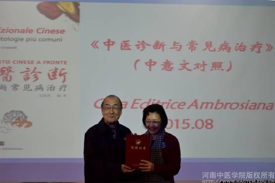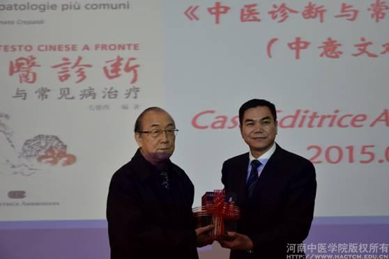 捐赠仪式上,毛德西教授向学校图书馆捐赠了其近期出版的《毛德西方药心悟》(人民卫生出版社出版)、《中国现代百名中医临床家丛书∙毛德西》、《365天养生趣谈》(中国中医药出版社出版)以及应意大利友人约请编著、由意大利Casa Editrice Ambrosiana出版社出版的《中医诊断与常见病治疗》(中意文对照)等四种图书。图书馆馆长李根林代表图书馆接受捐赠,郑玉玲校长为毛德西教授颁发了捐赠荣誉并代表全校师生向毛德西教授表示诚挚的谢意。