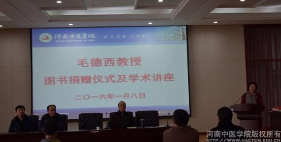 2016年1月8日下午,我校二附院全国名老中医药专家毛德西教授图书捐赠仪式及学术报告会在我校龙子湖校区图书馆第二报告厅如期举行。学校校长郑玉玲,二附院党委书记王海亮、党委副书记王禄,图书馆馆长李根林等出席活动。近200名师生参加活动并聆听报告。图书捐赠仪式和学术报告会由郑玉玲校长主持。