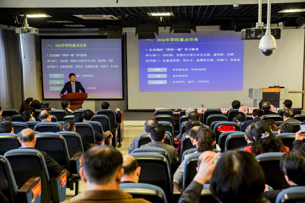 会上,校长许二平结合学校年度党政工作要点,部署了2016年度全校23项重点任务:搞好“两学一做”学习教育、落实党管意识形态工作和党风廉政建设责任制、争创省级文明单位标兵、申报“中西部高校基础能力建设二期工程”、推进大学生创新创业教育改革、做好中药学专业认证工作及中药学博士后科研流动站申报工作、推进国家级实验教学示范中心及虚拟仿真实验中心建设、推进东明校区资源综合改造利用的规划与建设、开展校内外交流与国际合作、推进校园信息化建设等重点任务。许校长根据近期调研提出了今后的工作思路:坚持办学方向,构建大学体系;坚持“五大发展理念”,服务健康中国战略;认真研究上级政策,紧紧抓住发展机遇;加强党性修养,讲究工作方法;坚持育人导向,强化学校职能;加强内涵建设,凸显办学特色,提升办学水平;以人为本,关注民生;提高服务意识,改进工作作风;科学规划,准确定位;转变观念,创新管理等。要紧盯学校发展目标,凝心聚智、团结协作、务实进取,为建设特色鲜明的高水平中医药大学作出新的贡献。