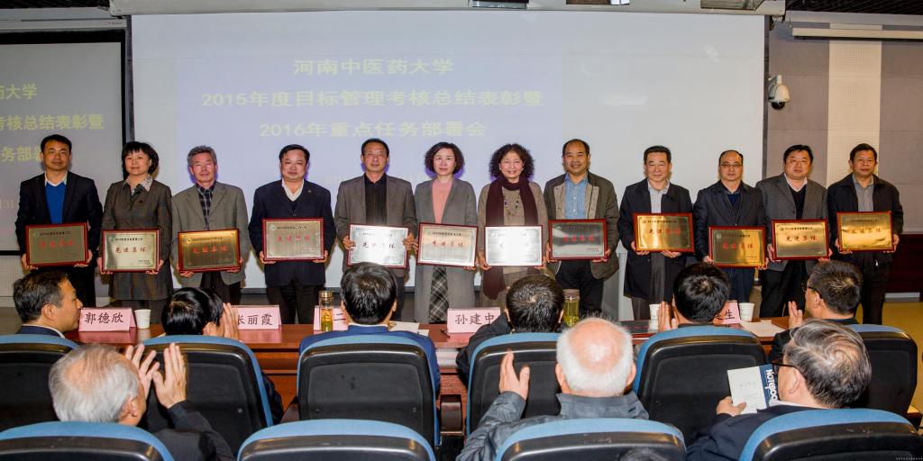 副校长郭德欣首先对2015年度目标管理考核工作回顾、目标管理考核评议结果、目标管理考核奖励办法等三个方面进行了简要总结,宣布了2015年度目标管理考核评议结果及奖励办法。之后,校领导分别为获奖部门和单位颁发奖牌。党委办公室校长办公室、教务处、组织部人事处、第一临床医学院(一附院)、第二临床医学院(二附院)、人文学院等6个部门和院部收获了特别优秀奖殊荣。获得A类优秀奖的部门和单位分别是:学科办、宣传统战部、离退休职工工作处、科学技术处、后勤集团公司、招生就业处、纪委监察处、基础医学院、药学院、第三临床医学院(三附院)、信息技术学院、国际教育学院。校工会、期刊社、后勤管理处获快速进步奖;去年在学校更名大学、国家级实验教学示范中心创建、全国中医药文化宣传教育基地报批等重大事项中做出突出贡献的党委办公室校长办公室、组织部人事处、教务处、教评中心、研究生处、科学技术处、学科办、计划财务处、招生就业处、国有资产管理处、图书馆、第二临床医学院(二附院)、宣传部、药学院等14个单位和部门获得了年度突出贡献奖。大会还为获得创新奖的部门和单位颁发了证书。