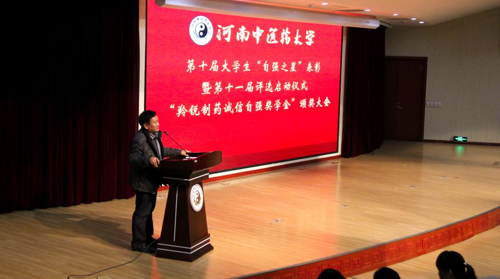 河南羚锐制药股份有限公司副总经理夏辉和我校党委副书记郭德欣分别发表讲话。羚锐制药夏总首先向当选我校“十大自强之星标兵”和“十大自强之星”的同学表示祝贺,并向大家介绍了羚锐制药目前的发展情况,希望我校毕业生能够积极踊跃到羚锐制药实习、就业,一起为中医药事业的发展做贡献。我校党委副书记郭德欣代表学校向河南羚锐制药股份有限公司心系中医药学子成长表示感谢;郭书记在向获奖同学表示祝贺的同时,也对在场及全校学生提出要求,希望大家能够锻造坚定信念,砥砺高尚品格,坚持艰苦奋斗,练就过硬本领,常怀感恩之心,勇担社会责任。