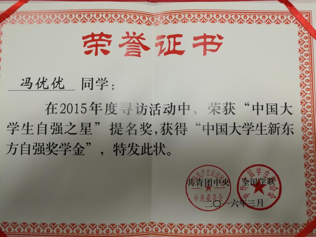 冯优优获得2015年度“中国大学生自强之星”提名奖