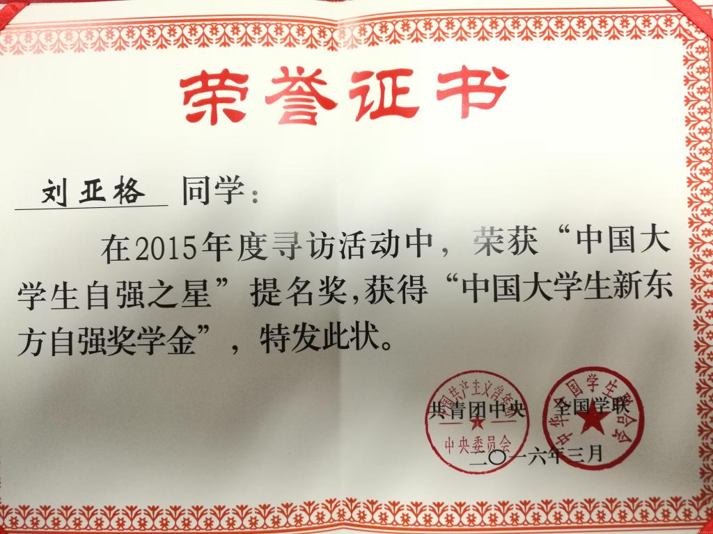 刘亚格获得2015年度“中国大学生自强之星”提名奖
