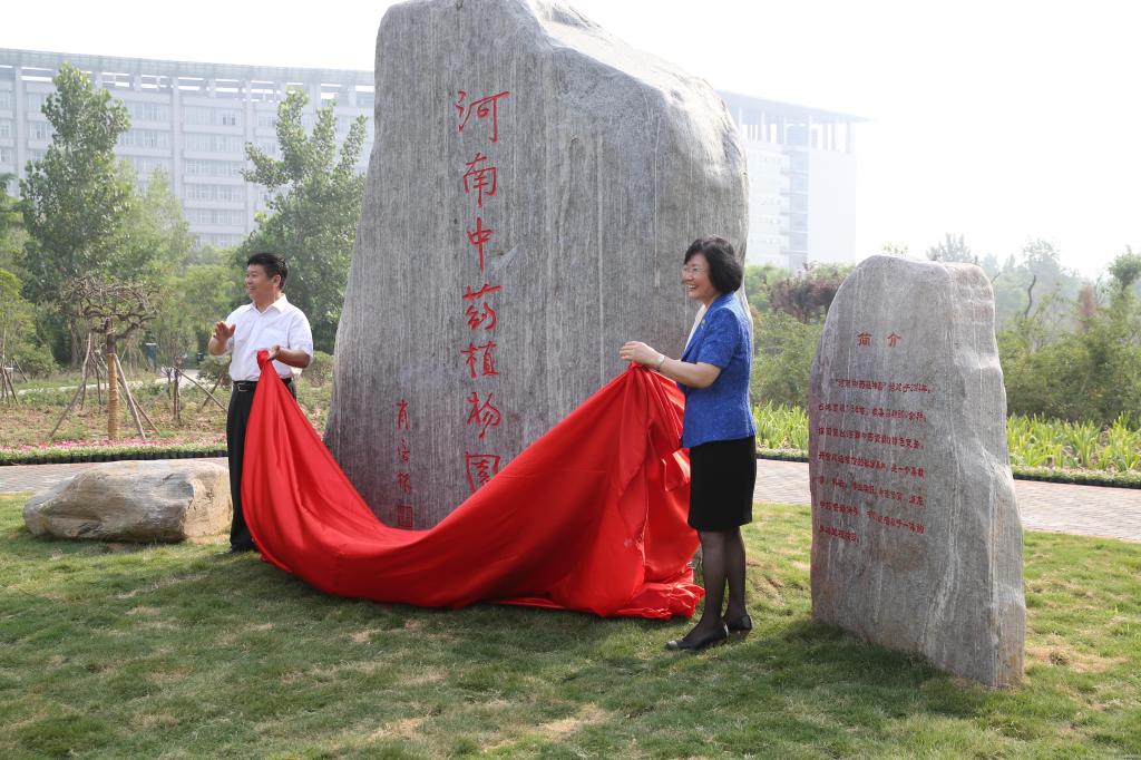 校党委书记孙建中与院长郑玉玲共同为河南中药植物园揭幕