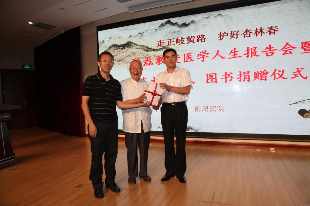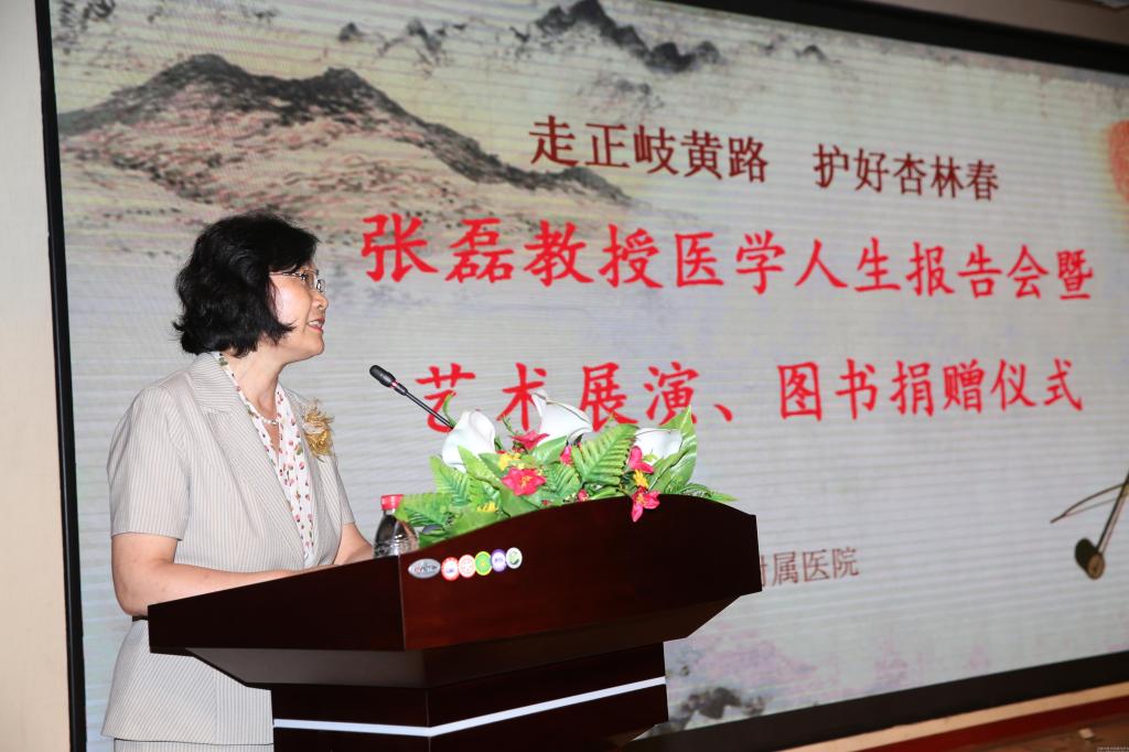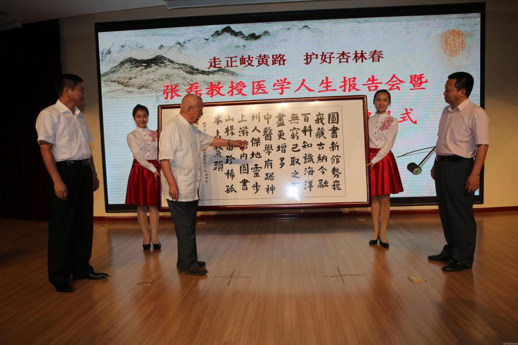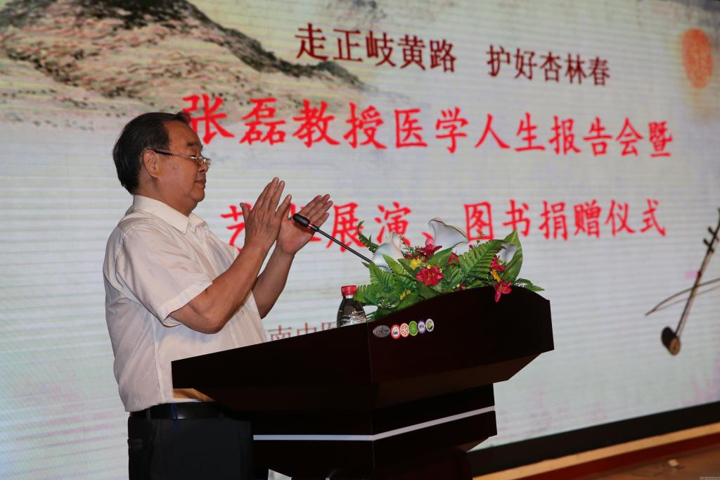在蓝天白云之下,我校新建成的图书馆格外挺拔,第一报告厅里座无虚席,不时传出掌声、笑声和音乐声,2015年7月10日下午,“走正岐黄路 护好杏林春——张磊教授医学人生报告会暨艺术展演、图书捐赠仪式”正在这里进行。