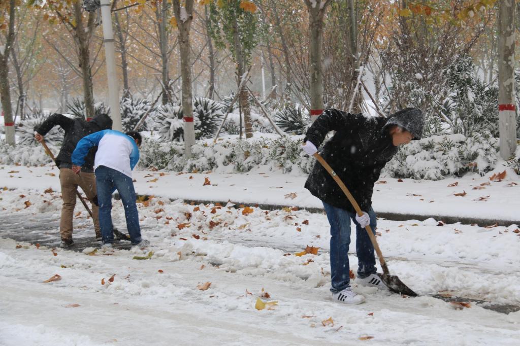 小雪节气已过,昨夜郑州突遇大雪,早上起来校园内银装素裹,道路上堆满了厚厚的积雪。为保障大家出行安全,2015年11月24日早上,由校学生会、阳光青年志愿者协会以及其他学生组织成员组成的大学生志愿团队,在校团委的统一规划下,对校园内主干道路上的积雪进行了清扫。
