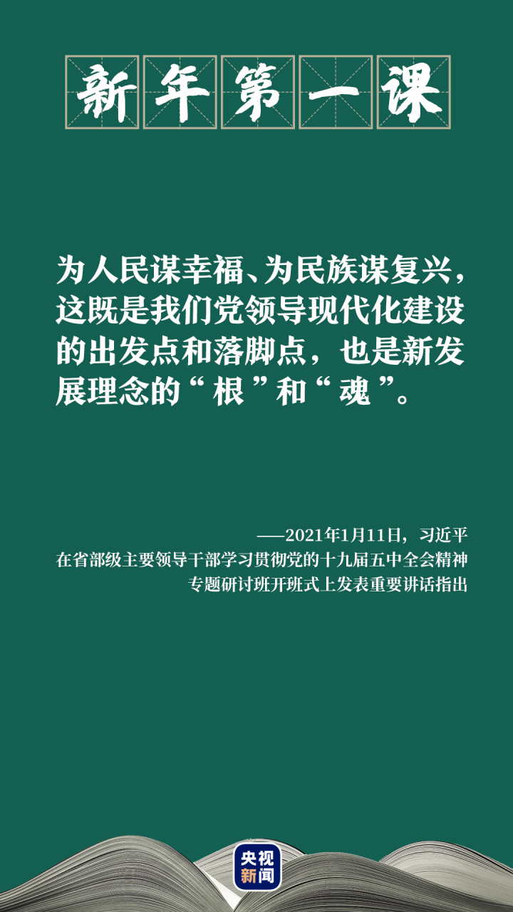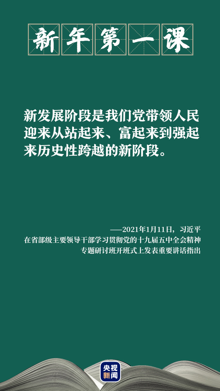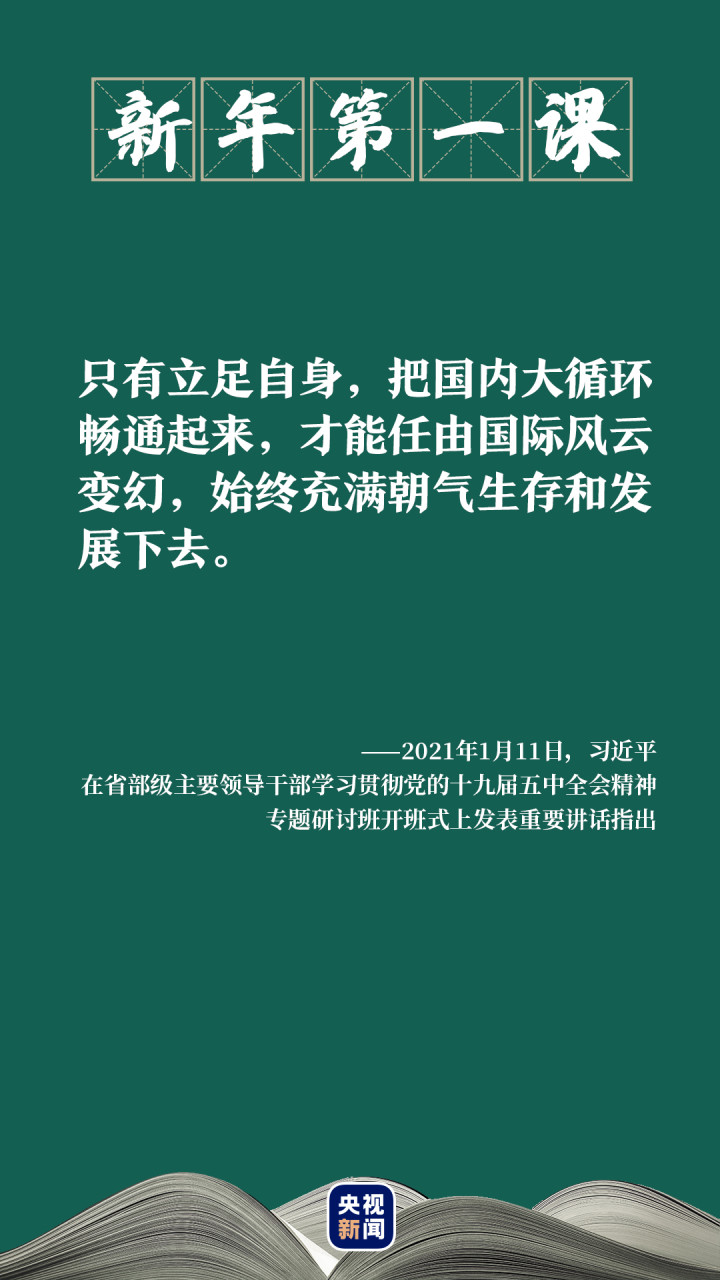 在这堂新年“第一课”上,习近平总书记从理论和实际、历史和现实、国内和国际相结合的高度,分析了我国进入新发展阶段的理论依据、历史依据、现实依据,阐述了深入贯彻新发展理念的新要求,阐明了加快构建新发展格局的主攻方向。