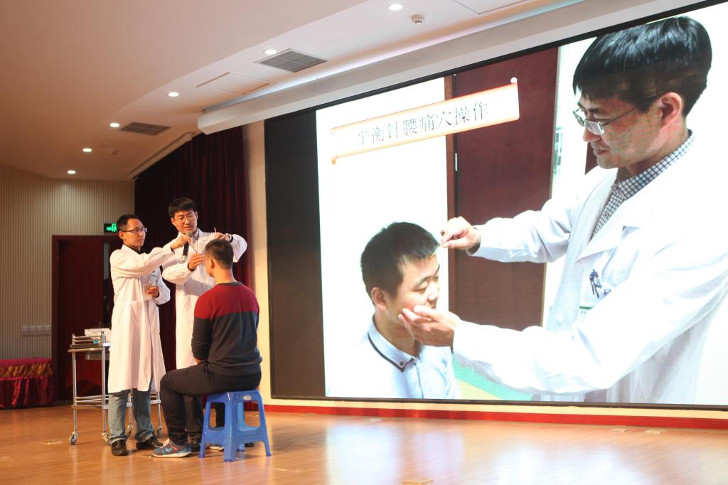 一附院脾胃肝胆科带来的疏肝健脾养胃操开启了展示活动的序幕。8名身着中式服装的红衣女子在悠扬的古琴乐曲中或动或静舒展着肢体,动作连绵柔和、松紧有弛,表达着中医运动强身、防病的“治未病”理念。一附院针灸科赵俐黎主任亲自带着12人的团队前来展示太极阴阳罐法和火龙灸,当模特展示经太极阴阳罐法治疗后背部完整的八卦图时,现场响起热烈的掌声。太极阴阳罐法是一附院针灸科根据阴阳学说的理论独创的一种复合罐法,综合音乐、太极、闪罐、留罐、走罐、精油等多种疗法,从而有平衡阴阳、调整脏腑、培元固本、消疲安神的作用,临床上用于亚健康状态的治疗。火龙灸的历史可以追溯到晋代,赵主任带领团队2007年挖掘整理了这种保健灸法,多年来为千余名亚健康患者解除了痛苦, 2012年经中央电视台中华医药栏目做专题报道后,在国内外引起了巨大反响。一尺多长的火苗从展示火龙灸医生手与模特背部的触点似一条金龙腾跃而起时,现场更是一片沸腾。二附院选送的八卦脐针是由自然堂副主任吕沛宛亲自操作的,吕主任的辩脐诊病再一次让观众感受到祖国医学的精妙神奇。三附院工会主席陶洁亲自带队,带来了捏脊疗法、踝三针、平衡针三个展示项目,当三附院康复科主任胡斌展示平衡针技术时,他自信的神态,优雅的解说,娴熟的技术瞬间就秒杀了现场观众。阳光青年志愿者协会的志愿者,不仅全程保障了活动的开展,还奉献了中医传统推拿技术展示。
