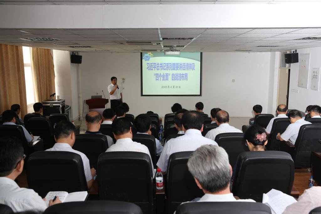 会上,宣传统战部部长刘保庆以《习近平总书记系列重要讲话精神及“四个全面”的战略布局》为题,与与会人员分享了学习习近平总书记系列重要讲话精神的心得体会。他从中央精神如何牢记入手,用数字“12345”进行了形象说明,即“一带一路”、“两个责任”、“三严三实”、“四个全面”、“五个必须”。接着,他分析了习近平总书记讲话的六大特点:一是坚定的理想信念。习近平总书记系列重要讲话始终贯穿着“永不动摇信念”这条红线,理想信念就是共产党人精神上的“钙”,要解决好世界观、人生观、价值观这个总开关问题。二是强烈的担当意识。强烈的责任感、使命感、紧迫感是做好工作的动力源泉。三是深厚的百姓情怀。体现在习近平总书记为人民服务的执政理念。四是严谨的求实精神。习近平总书记指出调研工作要深、实、细、准、效,领导干部要“三严三实”,筑牢思想防线、守住做人底线、不踩法规红线。五是扎实的理论功底。习近平总书记讲话涉及多学科门类知识,引用大量的典故、诗词、事例、数据,展现出总书记博览群书、博闻强记的特长和扎实的理论功底、渊博的知识素养。六是朴实的语言风格。习近平总书记系列重要讲话朴实生动、情真意切,说的是老百姓的话、讲的是老百姓的事。接着,他对习近平总书记系列重要讲话精神作了深入的解读,用“123456”进行了概括,即坚持一条主线、抓住二个关键、实现三个目标、防范“四种危险”、搞好五大建设、做到六个坚持。具体来说,就是坚持和发展中国特色社会主义这一主线,抓住改革开放和反腐倡廉两个关键,实现“双百一梦”的三个目标,防范精神懈怠、能力不足、脱离群众、消极腐败等“四种危险”,搞好经济建设、政治建设、文化建设、社会建设、生态文明建设等五大建设,做到坚持根本宗旨不忘本、坚持生于忧患不自满、坚持科学发展不动摇、坚持艰苦奋斗不懈怠、坚持真抓实干不停步、坚持惩治腐败不手软。最后他用《中国人,你要自信!》的视频短片结束了主题报告,提出要增强“三个自信”,为实现中华民族伟大复兴的中国梦而努力奋斗。
