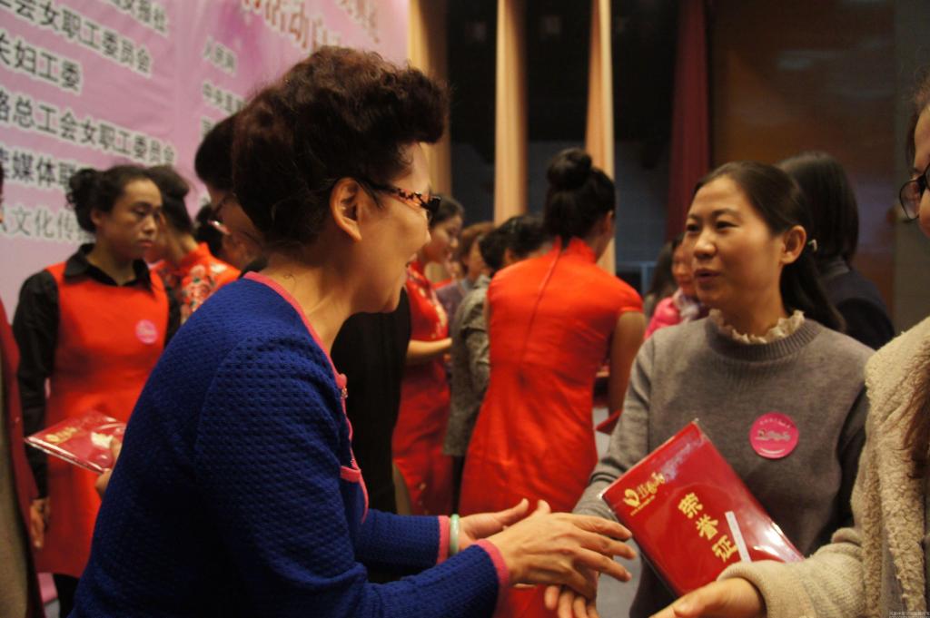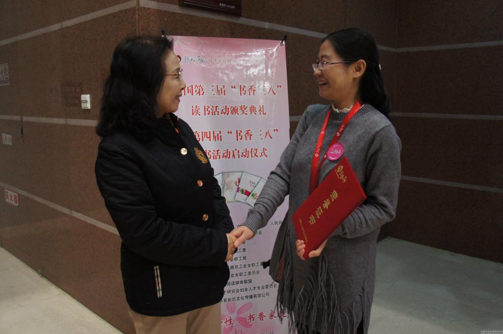 2015年12月1日,在北京中国现代文学馆举行的全国第三届“书香三八”读书活动颁奖典礼暨第四届“书香三八”读书活动启动仪式上,我校科学技术处女职工韩红艳从中直工委群工部副部长、中直机关妇工委主任崔钦华手中接过了一等奖的证书。届时,我省总工会女工部和各产业工会联合举办的“书香三八”活动落下帷幕,我校在此次征文活动中更是异军突起、独中两元,成为全国唯一一家。