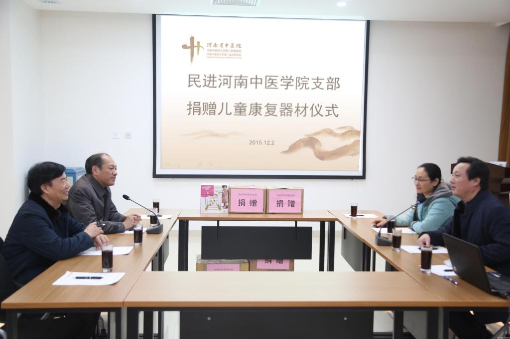 不久前,民进河南省委组宣处处长王彩虹和民进河南中医学院支部主委王祥麒带领我校民进支部的会员,走进二附院开展慈善帮扶活动,为该院儿童脑病康复科的患儿捐赠了一批儿童康复训练器材。二附院党委书记王海亮、副书记王禄和儿童脑病康复科的医护人员代表出席了捐赠仪式。