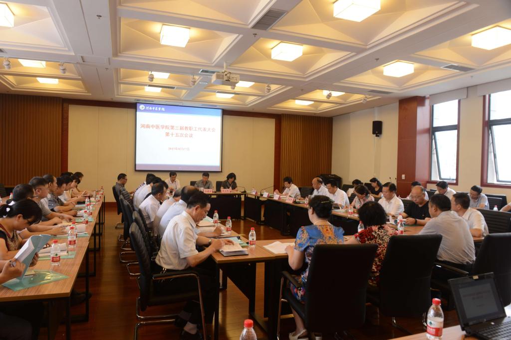 2015年8月17日下午,我校第三届教职工代表大会第十五次会议顺利召开,与会代表认真讨论审议《河南中医学院章程》。这是我校“依法治校”活动开展以来,首次召开教代会。校领导孙建中、郑玉玲、段荣章、郭海波、李建生、郭德欣、许二平、徐江雁、张小平、许东升作为教代会代表参加会议。校党委副书记、工会主席段荣章主持会议。