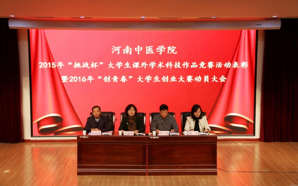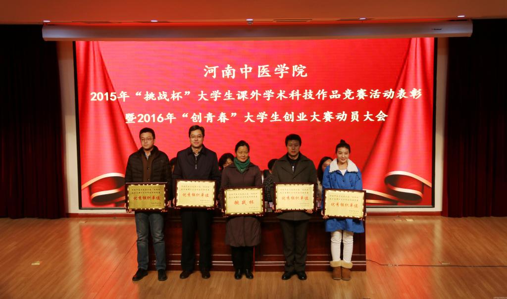 会上,副院长徐江雁首先宣读了全国第十四届、河南省第十二届“挑战杯”大学生课外学术科技作品竞赛获奖作品、个人名单,《关于表彰我院第六届“挑战杯”大学生课外学术科技作品竞赛的先进集体和个人的决定》以及《关于表彰河南中医学院大学生创业实践基地年度优秀创业团队的决定》。随后,部分获奖学生代表、获奖优秀组织单位以及我校大学生创业实践基地年度优秀创业团队代表上台接受了表彰。本次大会共表彰了我校获得省级三等奖的作品20件、省级二等奖作品10件、省级一等奖作品5件和国家级三等奖作品一件。其中,药学院获得“挑战杯”及“特殊贡献奖”;第一临床医学院、第二临床医学院、研究生处和人文学院等四个院(部)获得了“优秀组织单位奖”;我校大学生创业实践基地的河南美吉可创意设计有限公司获得最佳创业团队奖;蜂信子花艺等3个团队获得星级创业团队奖;睿米当等5个团队获得了优秀创业团队奖。表彰仪式结束后,副院长许二平宣读了《关于举办我校第六届“创青春”大学生创业大赛的通知》,对我校第六届“创青春”大学生创业大赛作了具体的规划。