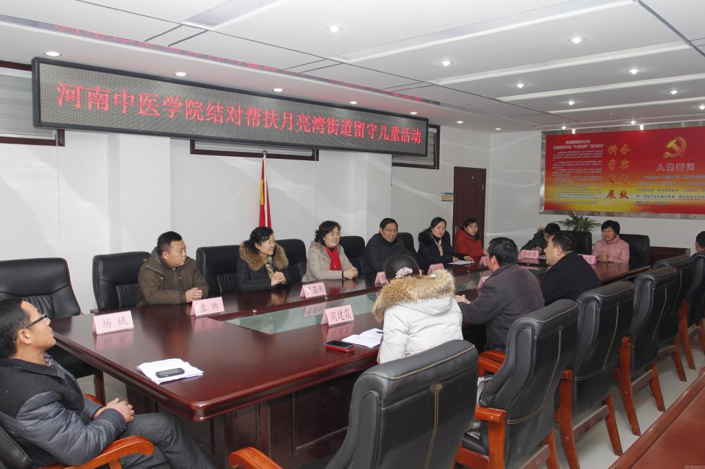13日下午,校党委副书记张丽霞一行不顾旅途劳顿,到达月亮湾社区后立即开展工作。在与留守儿童见面会上,月亮湾街道党工委书记梅贵普对张书记一行的到来表示欢迎,对我校近年来开展的精神文明结对帮扶活动表示感谢。会上,我校党委副书记张丽霞指出,近年来我校高度重视精神文明结对帮扶工作,一直关注月亮湾社区可喜的发展变化,每年都会选派医疗专家和优秀大学生开展义诊、健康咨询、暑期社会实践等帮扶活动,取得了一定成效。她表示,我校将继续发挥医疗健康服务的优势,与月亮湾社区和新蔡县开展更深层次的校地合作,为月亮湾社区和新蔡县医疗卫生事业的发展尽心尽力。