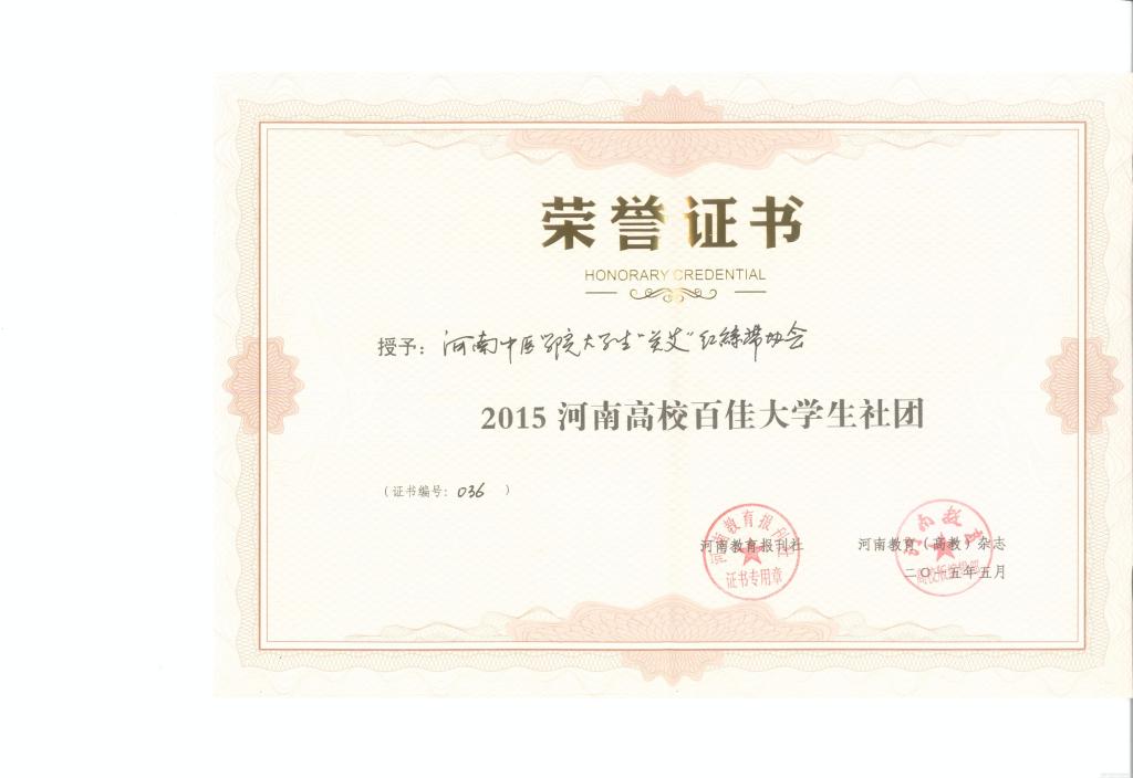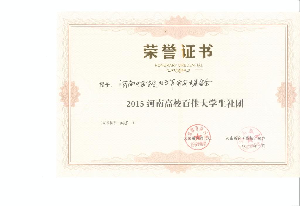 2015年5月30日,河南高校首届百佳大学生社团颁奖典礼在河南省华北水利水电大学第一报告厅举行,我校白云苹贫困生基金会、“关艾”红丝带协会荣获“河南百佳大学生社团“荣誉称号。