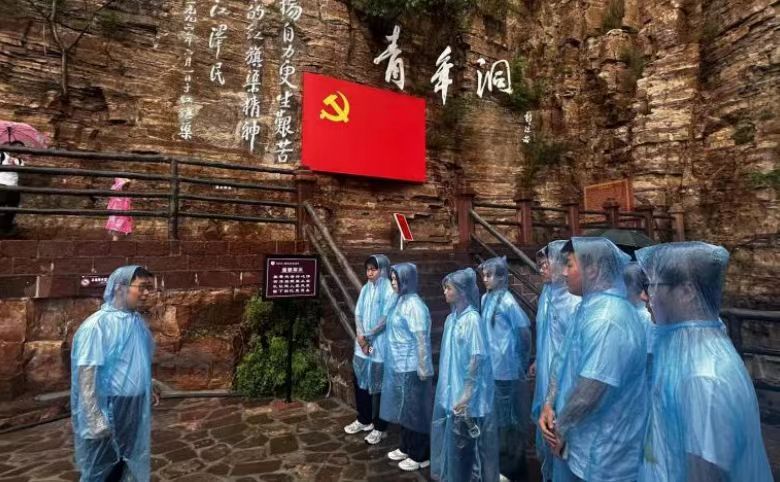 实践队走到那里,思政课就讲到那里,红色精神的传承在行走中不断加深加强。在洛阳,师生去到了张自安故居、中共伊洛抗日革命根据地、马河会议遗址等地;在信阳,师生来到了鄂豫皖革命根据地首府旧址、鄂豫皖苏区首府烈士陵园;在安阳,队员们在红旗渠感悟扁担精神、在殷墟体验历史的力量。在愚公故居,思政课教师姚肖雅与学生一同体验搬石推车、担山运石的艰辛。