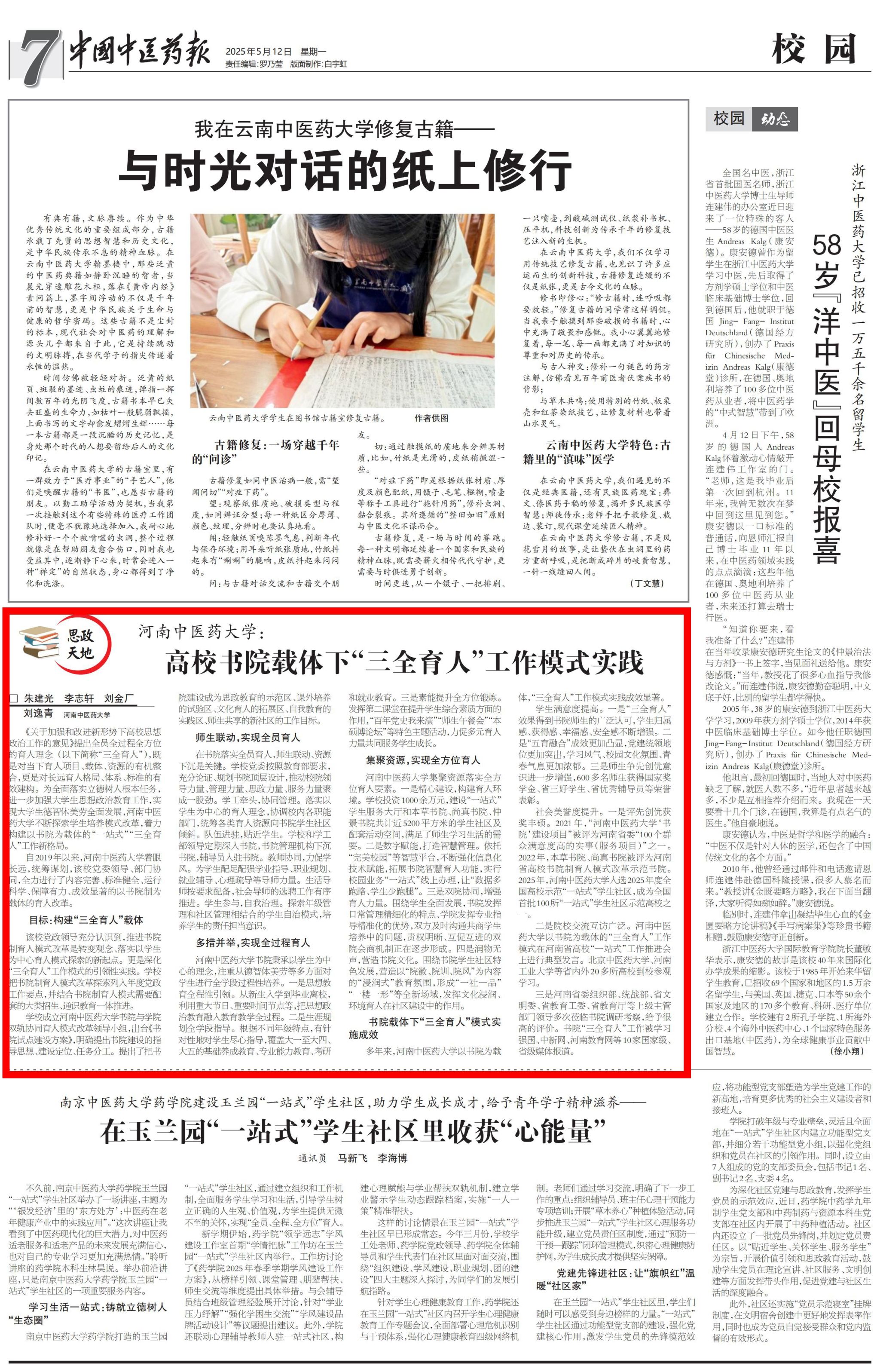 (二)社会美誉度提升。一是评先创优获奖丰硕。2021年,“乐动网页版登录入口,乐动(中国)‘书院’建设项目”被评为河南省委“100个群众满意度高的实事(服务项目)”之一。2022年,本草书院、尚真书院被评为河南省高校书院制育人模式改革示范书院。2025年,乐动网页版登录入口,乐动(中国)入选2025年度全国高校示范“一站式”学生社区,成为全国首批100所“一站式”学生社区示范高校之一。二是院校交流互访广泛。乐动网页版登录入口,乐动(中国)以书院为载体的“三全育人”工作模式在全省高校“一站式”工作推进会上进行典型发言。北京中医药大学、河南工业大学等省内外20多所高校到校参观学习。三是省委组织部、省委统战部、省文明委、省教育工委、省教育厅等上级主管部门领导多次莅临书院调研考察,给予很高的评价。书院“三全育人”工作被学习强国、中新网、河南教育网等10家国家级、省级媒体报道。