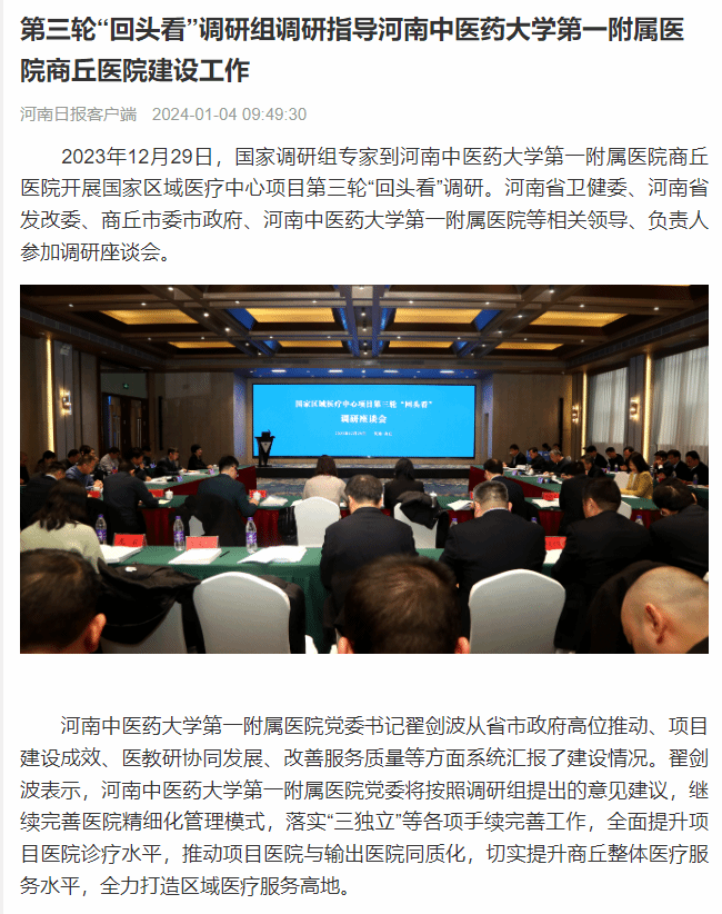 2023年12月29日,国家调研组专家到乐动网页版登录入口,乐动(中国)第一附属医院商丘医院开展国家区域医疗中心项目第三轮“回头看”调研。河南省卫健委、河南省发改委、商丘市委市政府、乐动网页版登录入口,乐动(中国)第一附属医院等相关领导、负责人参加调研座谈会。