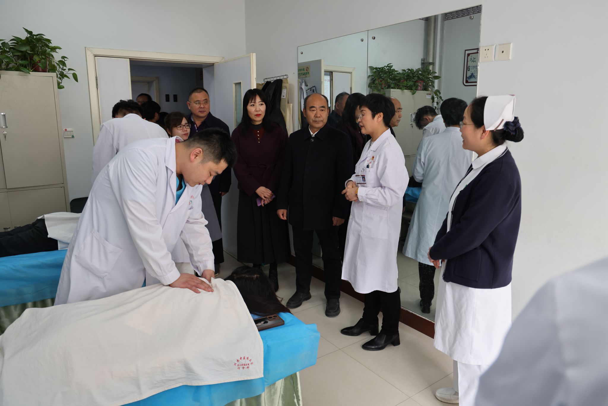 赵学庆一行首先参观了三附院党建文化长廊、岐黄广场,认真听取了医院近年来在党的建设、医院发展、中医药文化推广等方面的工作情况。随后,赵学庆一行深入推拿科一病区、治未病中心等地,实地查看了解三附院针灸推拿等中医特色疗法开展情况。在中医综合治疗区,赵学庆认真听取了推拿科一病区通过推拿等特色疗法治疗脊柱、关节疾病的工作情况,详细询问治疗效果、患者体验等情况。在治未病中心,赵学庆一行详细了解了针灸、推拿、中药塌渍等的临床应用,观摩了透灸等特色疗法。