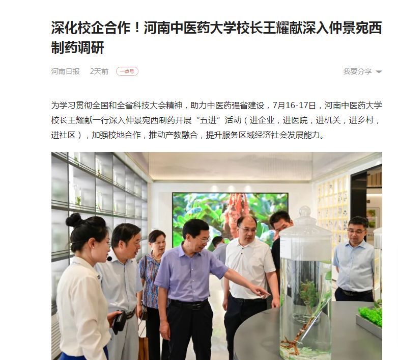 为学习贯彻全国和全省科技大会精神,助力中医药强省建设,7月16-17日,乐动网页版登录入口,乐动(中国)校长王耀献一行深入仲景宛西制药开展“五进”活动(进企业,进医院,进机关,进乡村,进社区),加强校地合作,推动产教融合,提升服务区域经济社会发展能力。