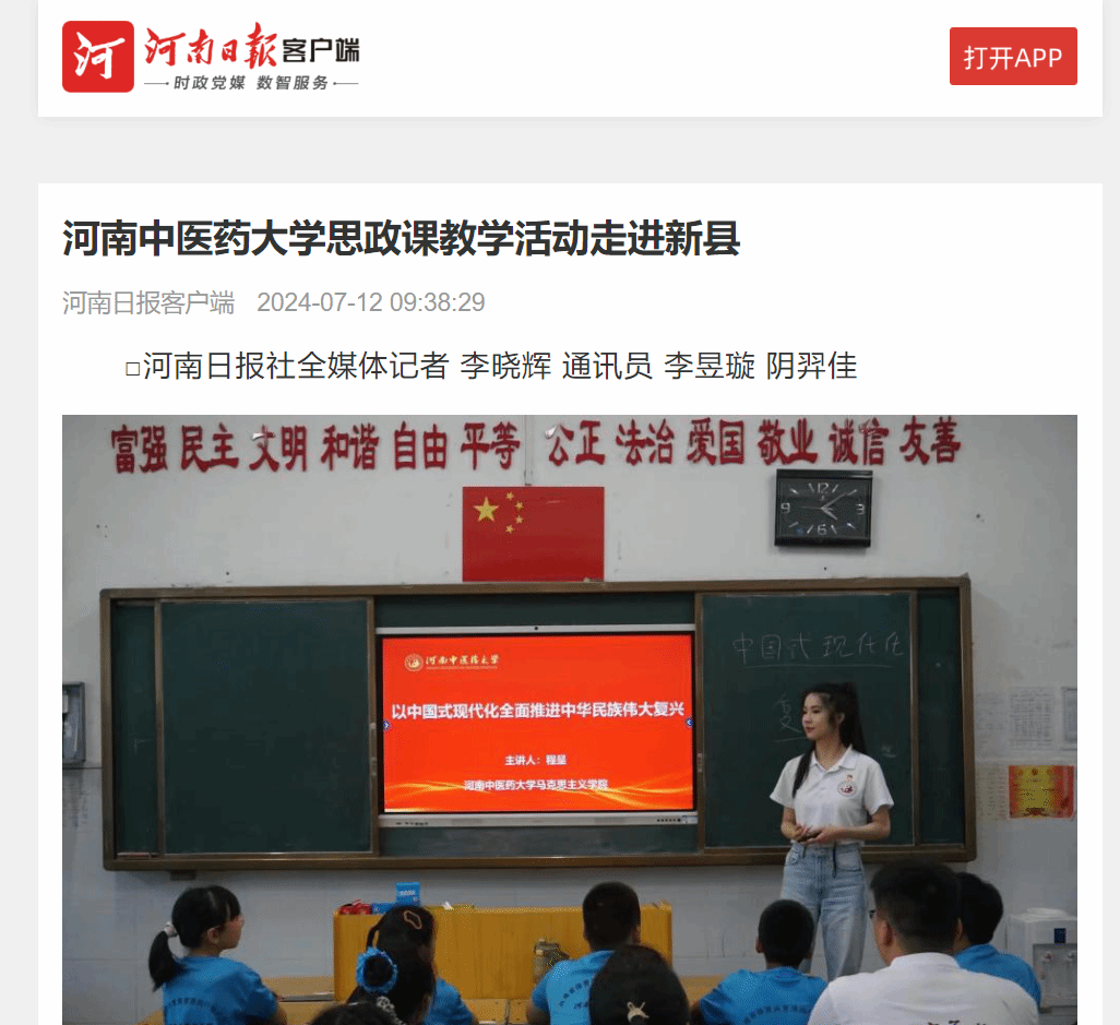 2024年7月9日,乐动网页版登录入口,乐动(中国)随队思政教师程呈面向该校体育健康学院暑期“三下乡”社会实践小分队成员、新县光彩实验学校学生,以“中国式现代化全面推进中华民族伟大复兴”为主题,在光彩实验学校教学楼601教室开展思政课教学活动。