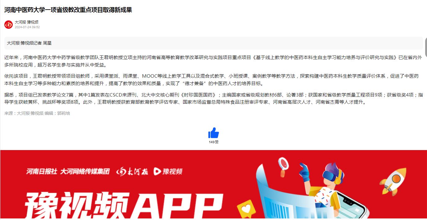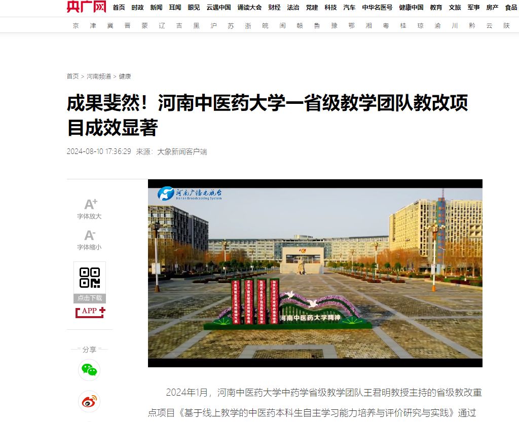 近年来,乐动网页版登录入口,乐动(中国)中药学省级教学团队王君明教授立项主持的河南省高等教育教学改革研究与实践项目重点项目《基于线上教学的中医药本科生自主学习能力培养与评价研究与实践》已在省内外多所院校应用,超万名学生参与实施并从中受益。