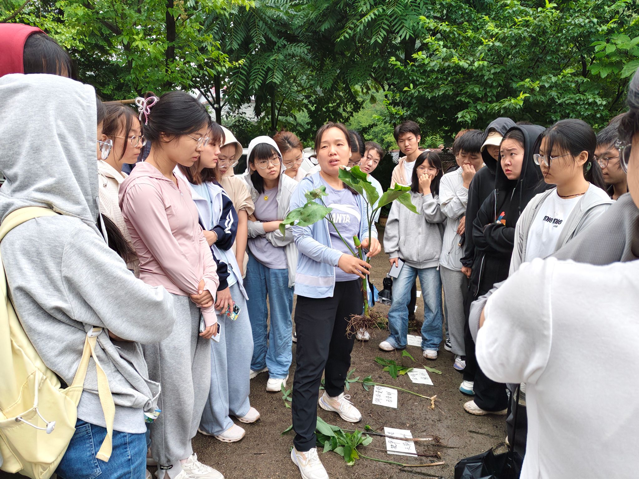 透过树叶缝隙仰望天空,穿过一个又一个水坑,触摸沾在植物上微凉的雨珠,走在药用植物生长的自然宝库中,中药学的学生与中药材同频共振,发出了“乡间无杂草,认识全是宝”的感叹。