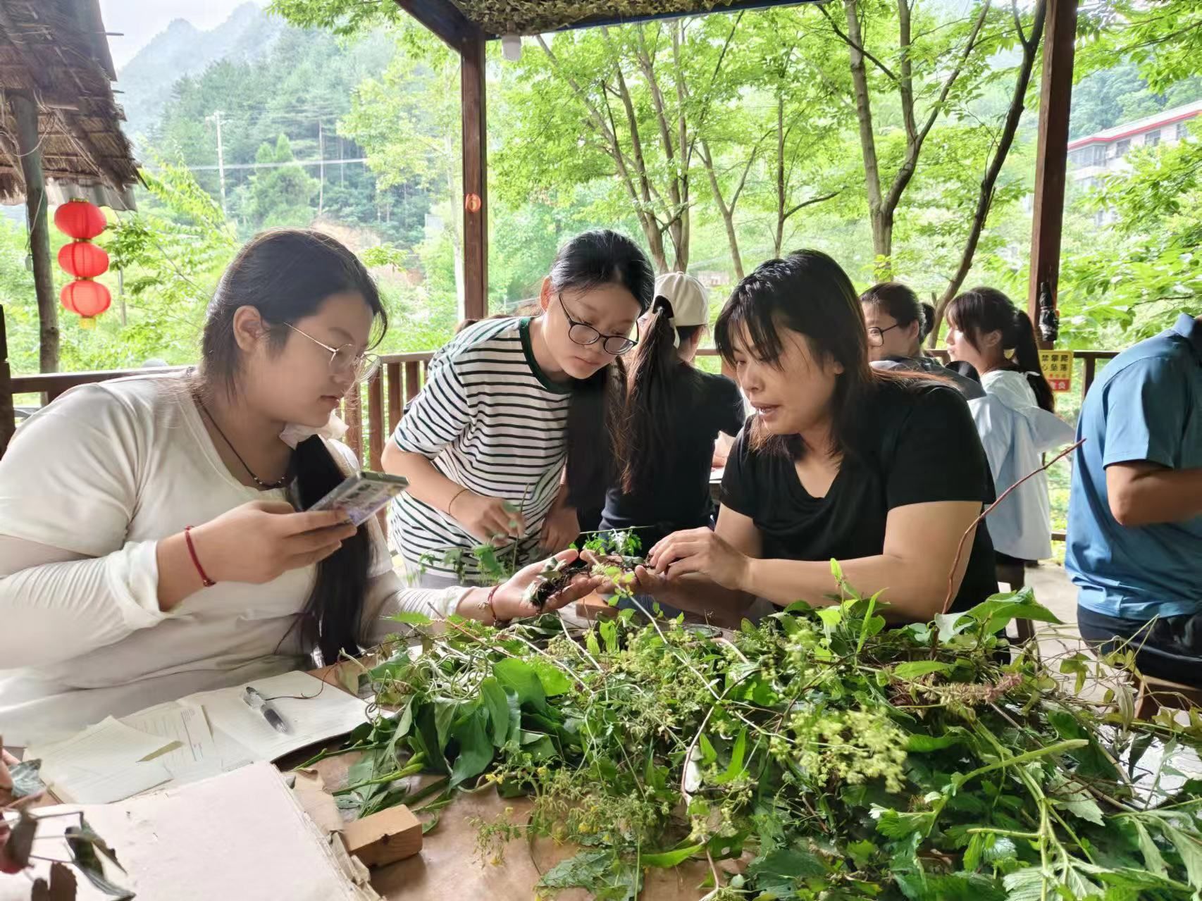 山间微风拂面带走燥热,书本被翻得哗哗响。采回样本后,研学成员忙着围桌讨论,并在老师的指导下完成标本的辨识和制作。