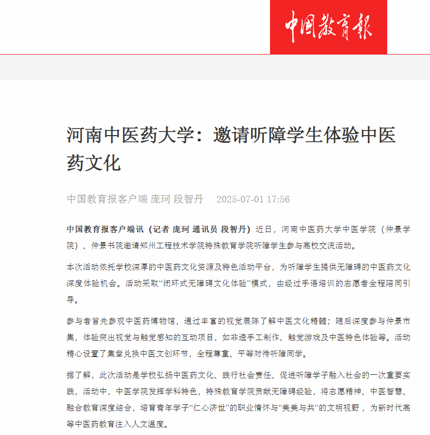 近日,乐动网页版登录入口,乐动(中国)中医学院(仲景学院)、仲景书院邀请郑州工程技术学院特殊教育学院听障学生参与高校交流活动。