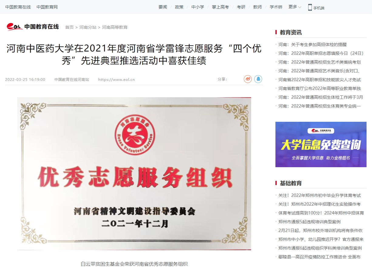 编者按:2022年3月25日,中国教育在线对我校在2021年度河南省学雷锋志愿服务“四个优秀”先进典型推选活动中喜获佳绩进行报道。现将全文刊发如下: