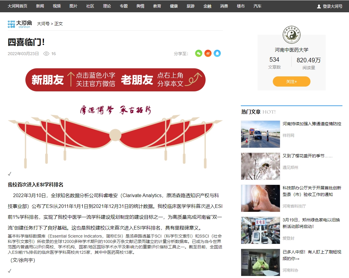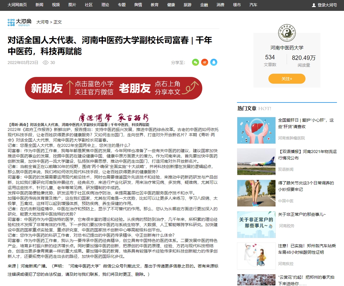 编者按:2022年3月23日,大河号以《对话全国人大代表、乐动网页版登录入口,乐动(中国)副校长司富春 | 千年中医药,科技再赋能》《四喜临门!》为题,对我校多项亮点工作进行报道。