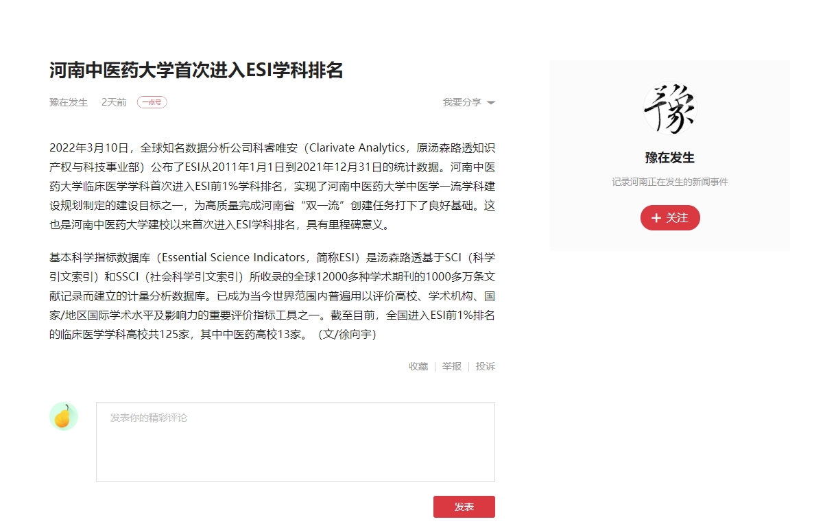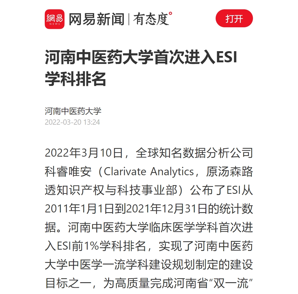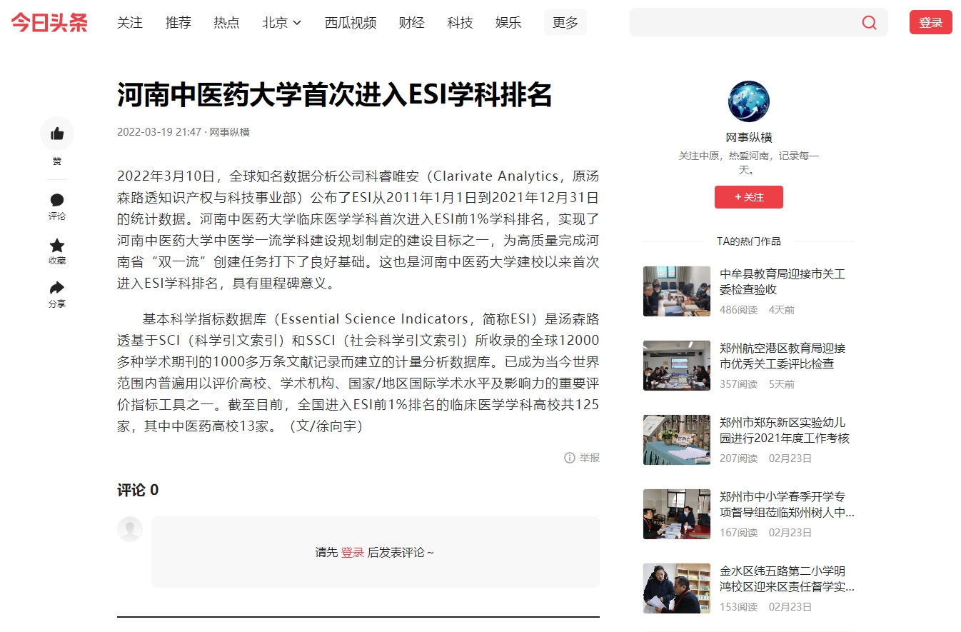 2022年3月19日-20日,搜狐新闻、今日头条、一点号、网易新闻等多家媒体对我校首次进入ESI学科排名进行报道。