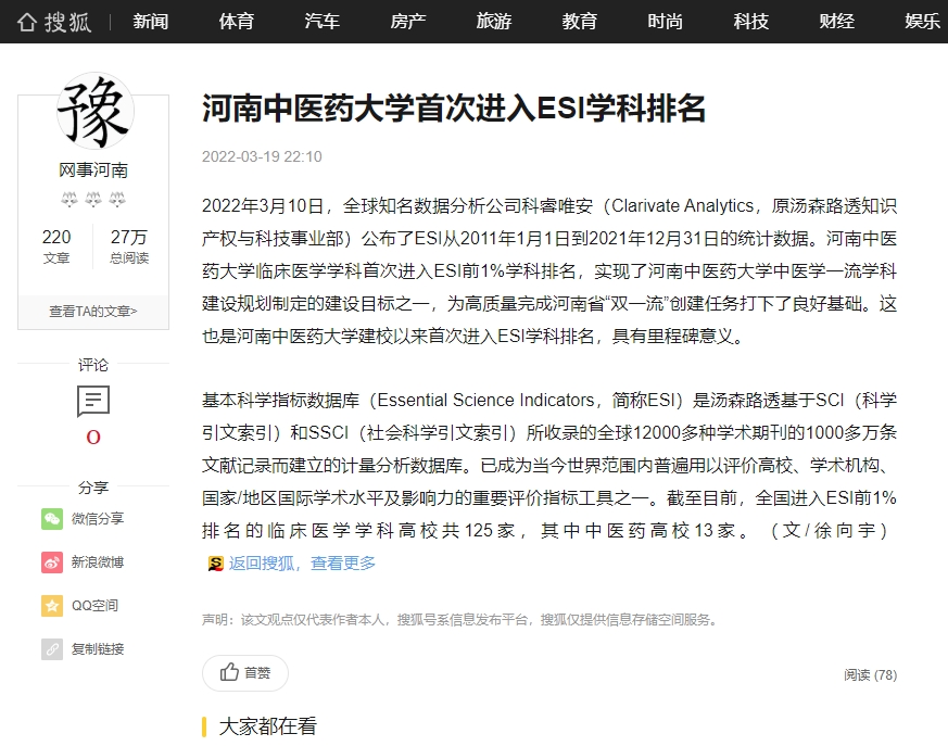 搜狐新闻等丨乐动网页版登录入口,乐动(中国)首次进入ESI学科排名