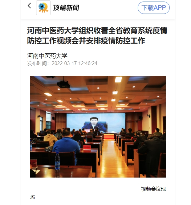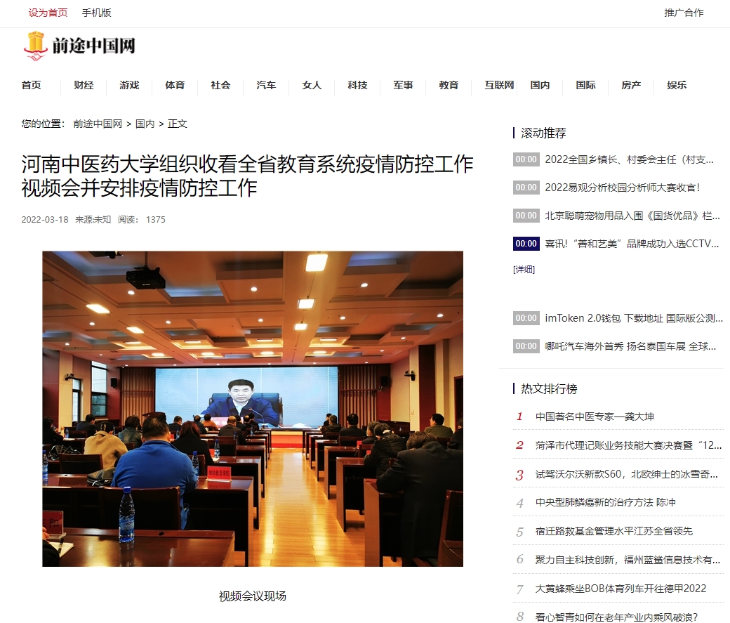 编者按:2022年3月17日-18日,顶端新闻、中国信息网、科技中国、前途中国网、美丽中国报、中国梦网、经典中国、中国侨报网、中国健康周刊、中国网讯、中国前沿观察网等媒体对我校组织收看全省教育系统疫情防控工作视频会并安排疫情防控工作进行报道。